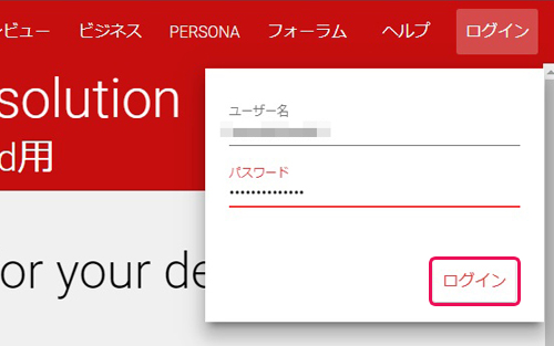 画面右上の「ログイン」で画面を表示させて「ユーザー名」と「パスワード」を入力したら下にある「ログイン」をクリックします。