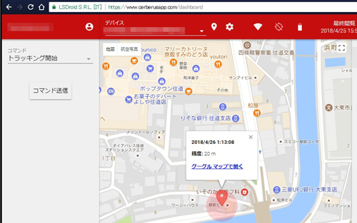 画面左側にあるコマンドが「トラッキング開始」になっているのを確認して「コマンド送信」をクリックすると、さらに移動経路を記録することもできます。