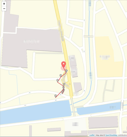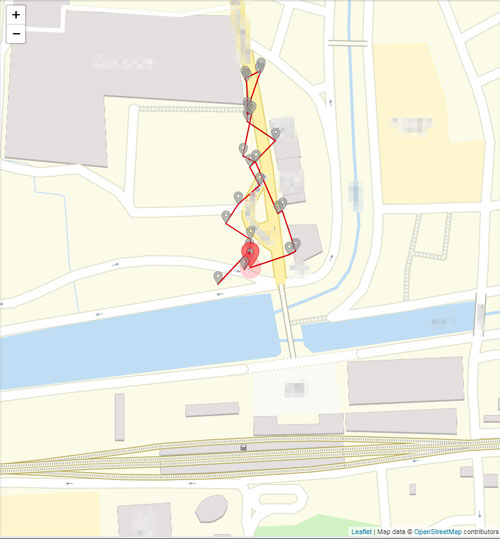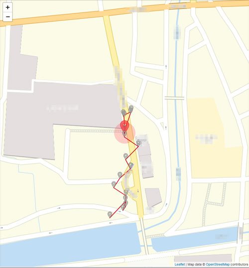 この状態になると、監視対象スマホのGPSによる位置情報を、数秒ごとに地図へ書き込んで行ってくれます。
