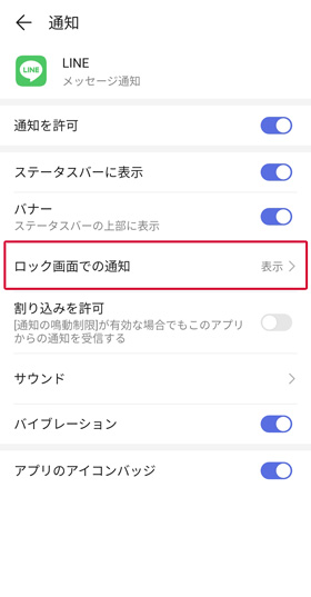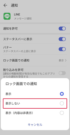 「表示しない」を選択することで、LINEの通知そのものはきても、ロック画面にポップアップが通知されなくなります。