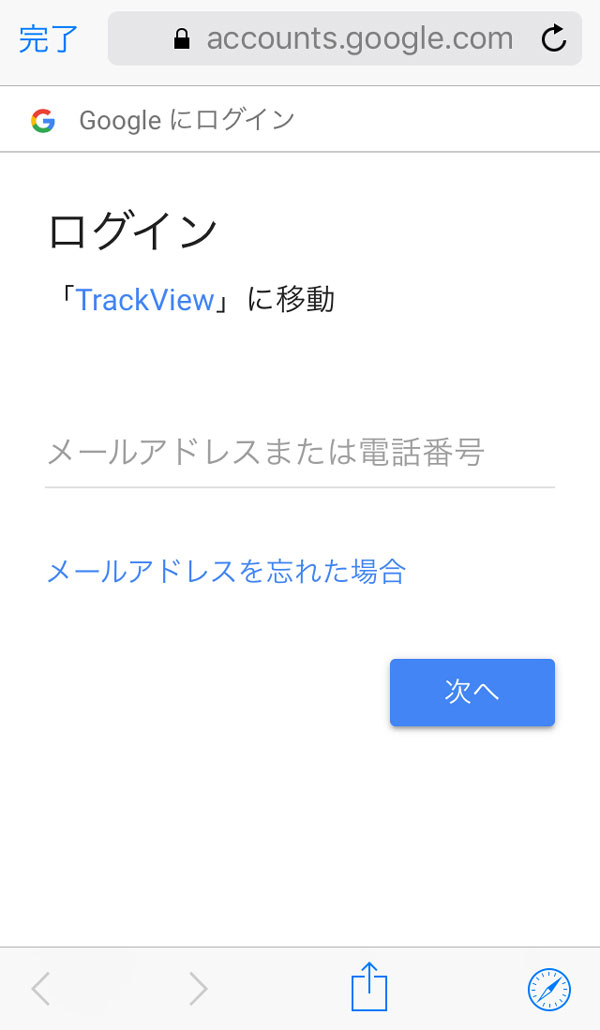 TrackViewtを使用するにはまずApp Storeから「TrackView」アプリを検索してインストールます。アプリを開いたら「Googleでログイン」をタッチしてください。