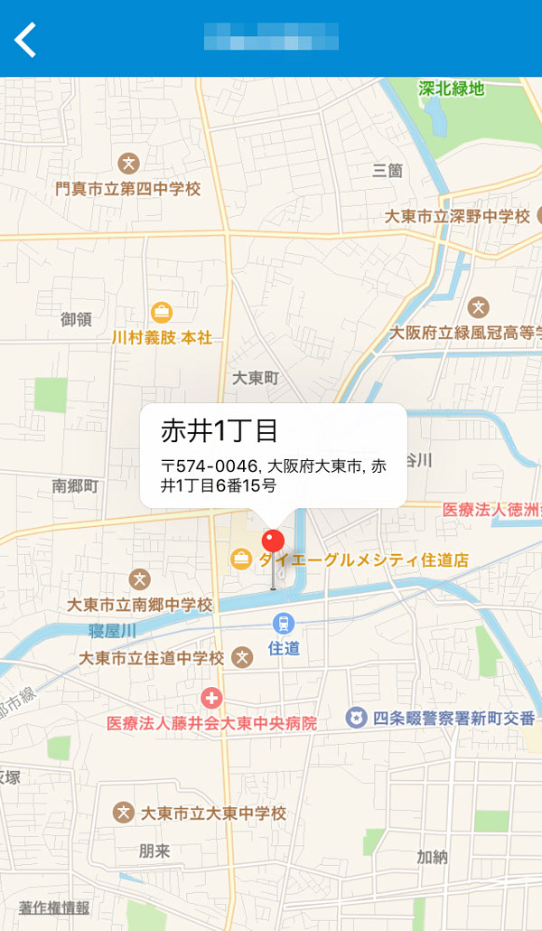 相手デバイスの一覧から「現在地を示すピンマーク」をタッチすると相手の現在位置が表示されます。